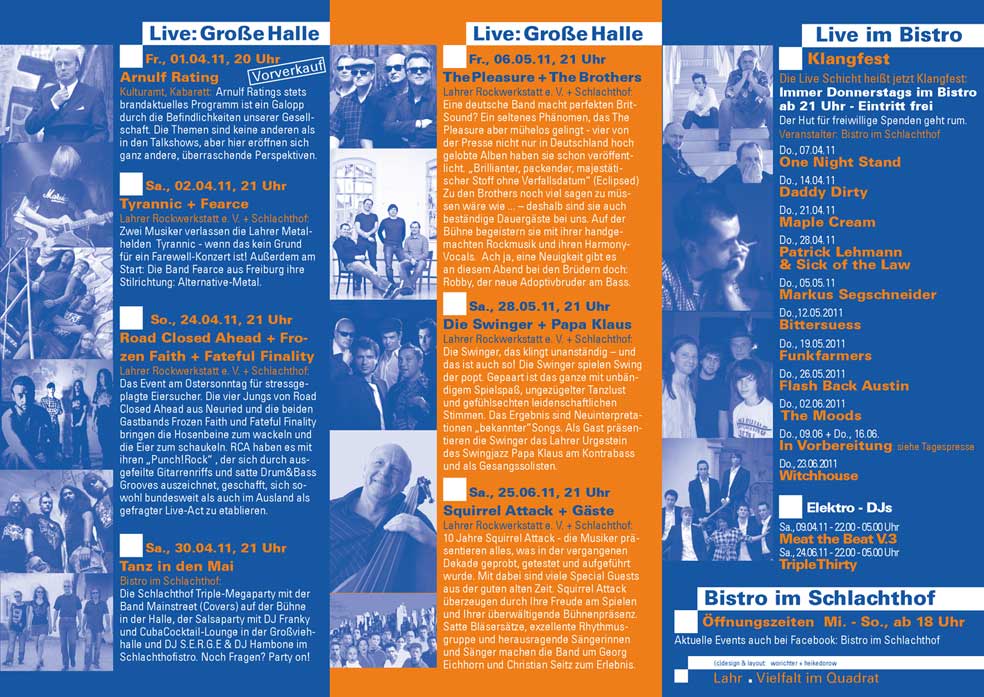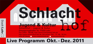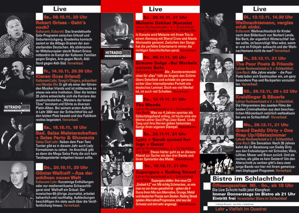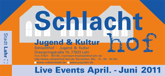 Hier ist es, das brandneue Programm mit allen kommenden Live – Veranstaltungen im Schlachthof. Bis an Weihnachten haben wir und das Kulturamt abwechslungsreiche Veranstaltungen für jeden Geschmack zusammengestellt. Neben alten Bekannten gibt es viele neue Bands zu entdecken, die bisher im Schlachthof noch nie zu sehen und zu hören waren. Wir freuen uns auf Euer Kommen!